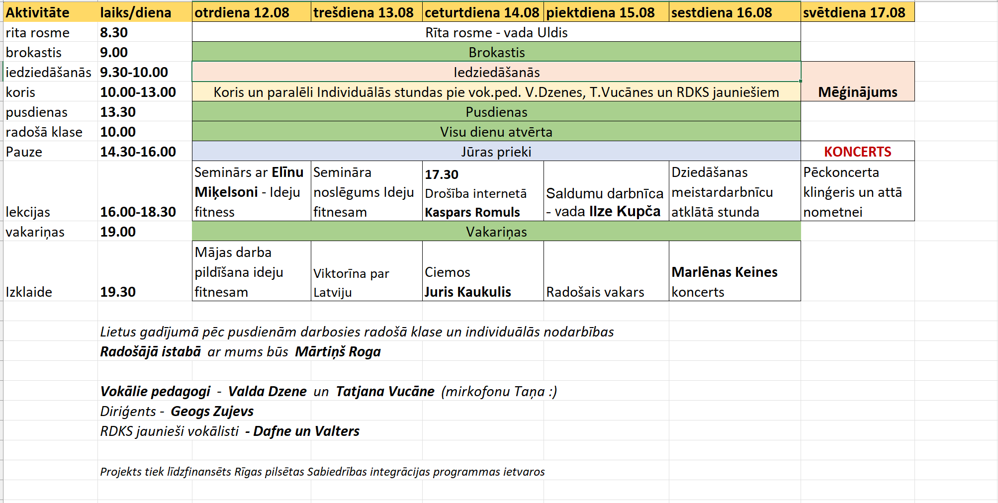 Tā ir fantastiska nedēļa būt pašiem, tādiem kādi viņi ir.Nesaprotamā veidā, pat pilnīgi neredzīgie jaunieši jau 8.30 ir uz rīta rosmi, tad kora iedziedāšanās, tad kora mēģinājums, atpūta pie jūras, un katru vakaru kāds ļoti labs izglītojošs pasākums.